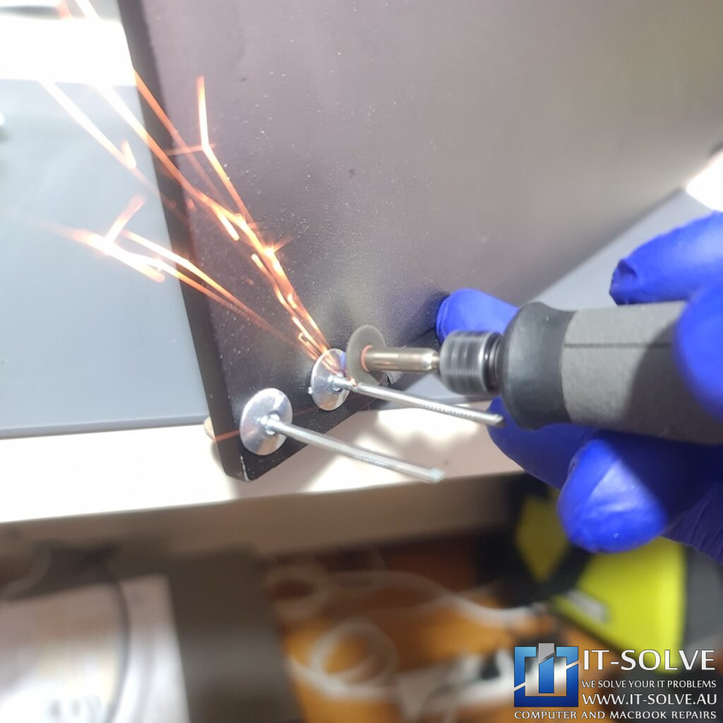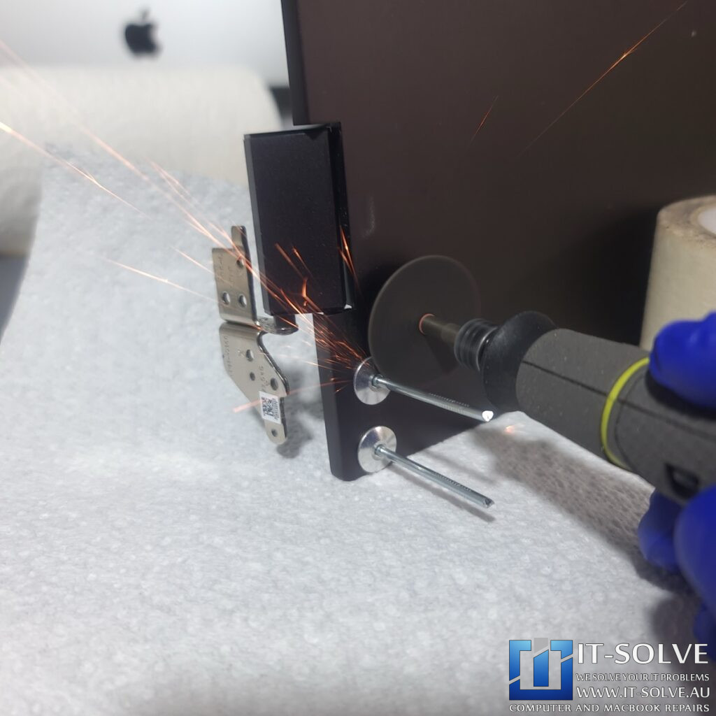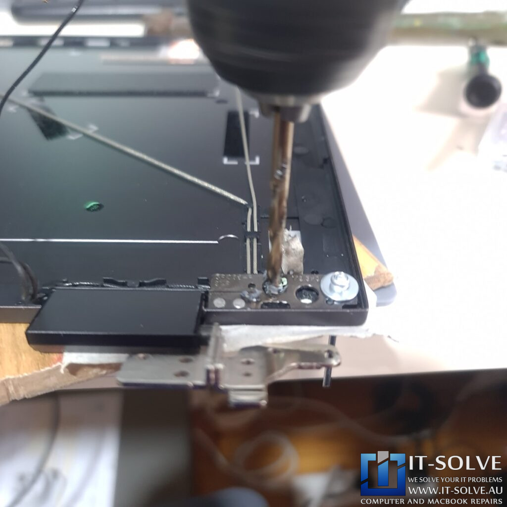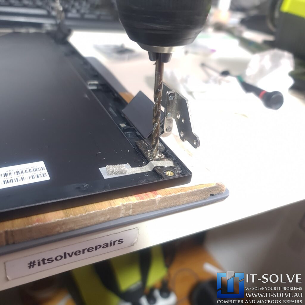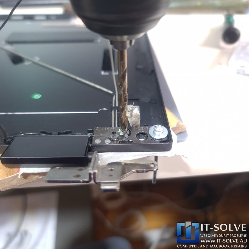 ![Photo showing the broken plastic hinge supports and loose brass nuts] While it might seem easier to replace the entire back cover, a new part would have the same design flaw. It would likely fail again in another two years. Instead of a temporary fix, we perform a structural HP Envy Hinge Repair in Adelaide. We choose to drill through the back cover and run aluminum rivets directly through the metal hinge.